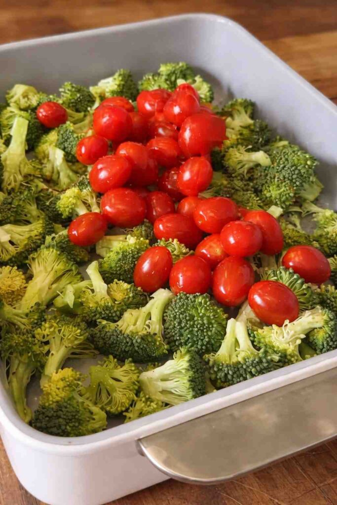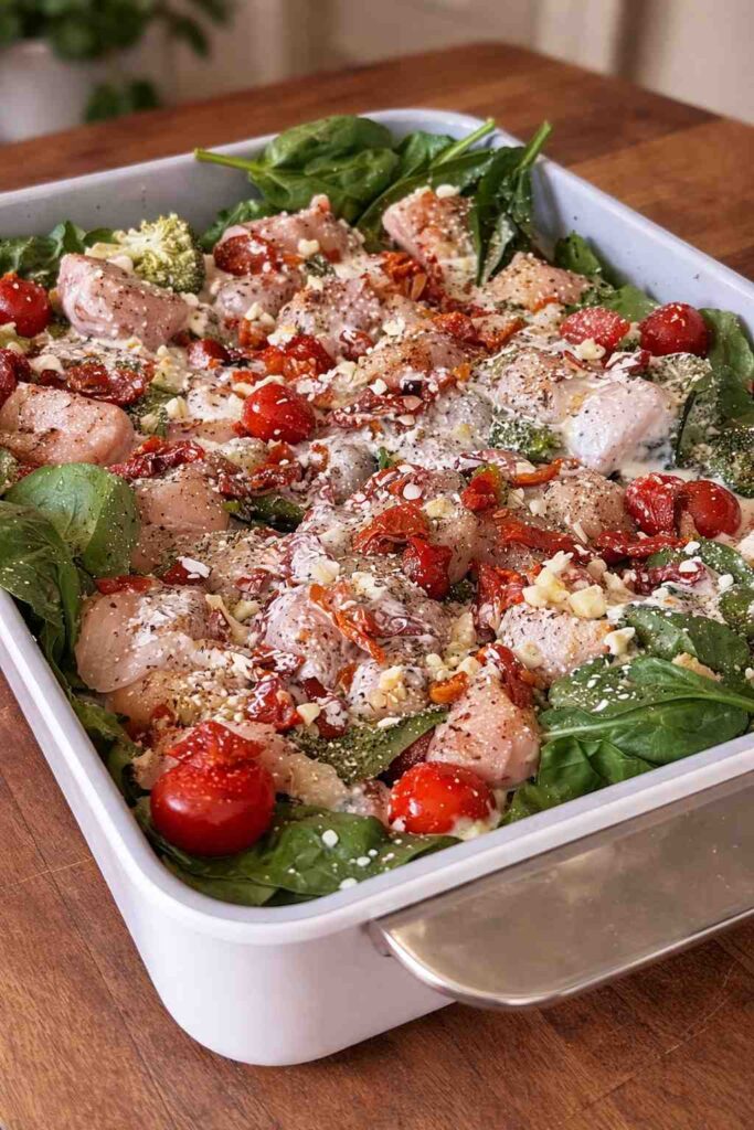 - Combine Base Ingredients: Directly in your baking dish, add the cubed chicken breast, broccoli florets, cherry tomatoes, and a generous handful of fresh spinach.