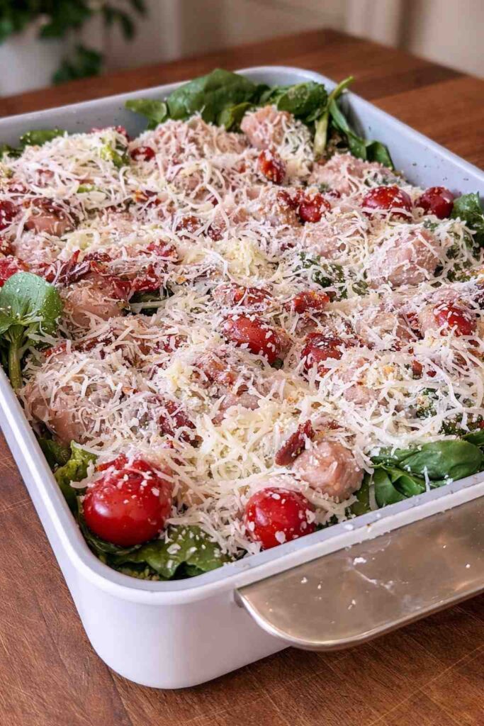 The magic of this recipe lies in its simplicity and its robust flavor profile. We utilize classic Tuscan ingredients like sun-dried tomatoes, fresh spinach, and a rich, creamy garlic sauce to coat tender pieces of chicken and roasted vegetables. The result is a vibrant, colorful casserole that bubbles with golden melted mozzarella and parmesan cheese. It’s a “dump-and-bake” meal that minimizes cleanup and maximizes satisfaction. Whether you are meal prepping for the week or scrambling to get dinner on the table after a long workday, this high-protein, gluten-free bake is your new go-to solution for a guilt-free comfort meal.