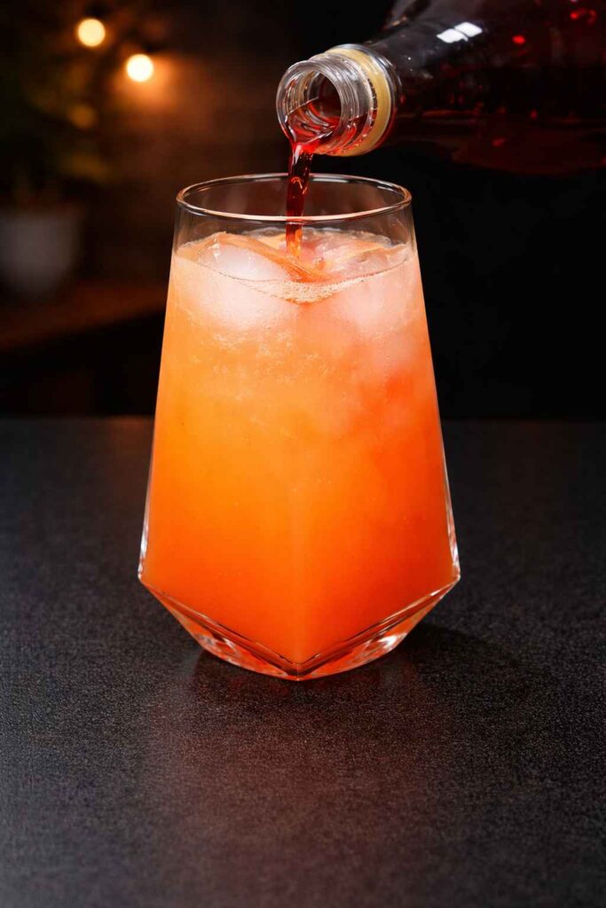 - Create the Sunrise by slowly pouring grenadine or berry syrup down the inside edge of the glass. The heavy syrup will naturally sink to the bottom and gradually ooze upward, resulting in the characteristic dawn gradient.