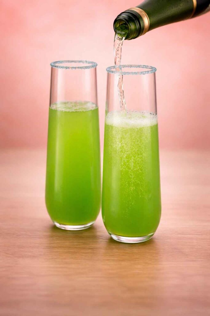 This is the moment the Mermaid Mimosa fully comes alive. Remove the Champagne from the refrigerator and hold the bottle firmly with a cloth over the cork as a precaution. Open by holding the cork firmly and rotating the bottle rather than the cork itself, giving you complete control over the release and preventing the violent pop and foam-over that results from twisting the cork. Tilt the champagne flute at a 45-degree angle and pour the Champagne in a slow, thin, steady stream down the inside wall of the glass rather than directly into the center. This angled wall-pour technique minimizes turbulence, preserves CO2, and prevents the catastrophic foam-over that occurs when sparkling wine meets still liquid at speed. Watch as the Champagne slides down the wall and encounters the teal cocktail base below. A cloud of fine bubbles erupts from the interface and rises in continuous streams through the colored liquid, carrying aromatic compounds to the surface with every ascending column of carbonation. Continue pouring slowly until the flute is filled to approximately one centimeter below the blue sugar rim. Straighten the glass gently as the level approaches the top. The Champagne’s pale golden color at the surface contrasting with the teal below creates the cocktail’s final finished gradient.