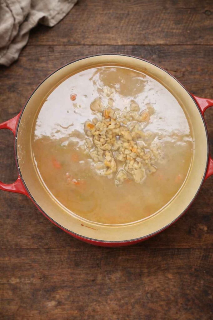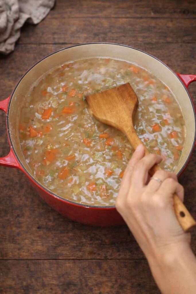 Put the finely chopped celery, sliced carrots, and diced onion right into the hot bacon fat. Cook for 7 to 8 minutes, stirring every so often, until the vegetables are soft, lightly golden, and have released their natural sugars. Take your time with this step. The soft caramelization going on in the pot is making the base flavor structure for the whole soup.