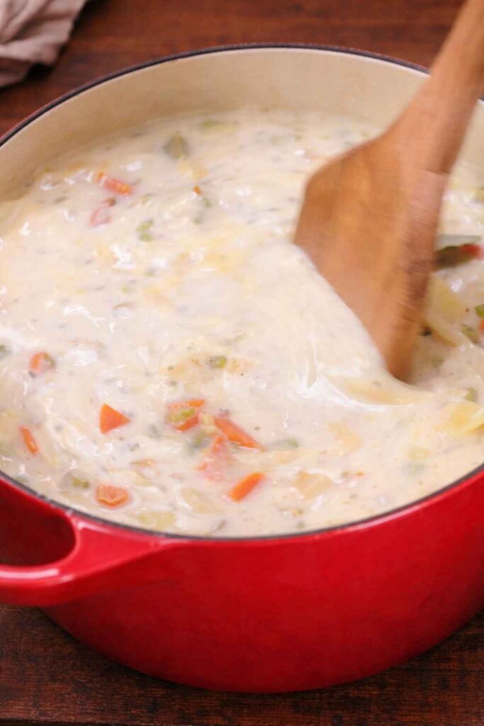 Put the whole milk, chopped potatoes, and whipping cream in the pot. Mix everything together well by stirring. Turn the heat back up to high and let the soup boil again. Put a lid on the pot and let the chowder simmer for about 20 minutes, or until the potato pieces are very soft and a fork can easily pierce them without any trouble.