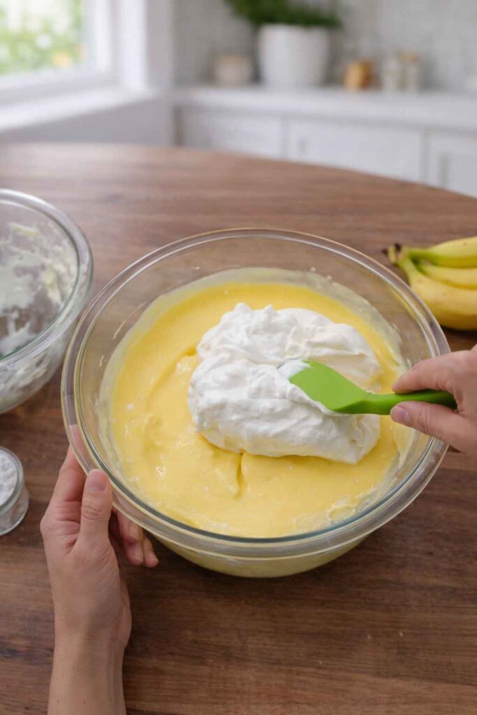 In a separate chilled bowl, beat the heavy whipping cream until stiff peaks form. Divide the whipped cream into two portions: two-thirds and one-third. Gently fold the larger portion into the pudding mixture using a rubber spatula. This step lightens the pudding and gives it that signature creamy texture.
