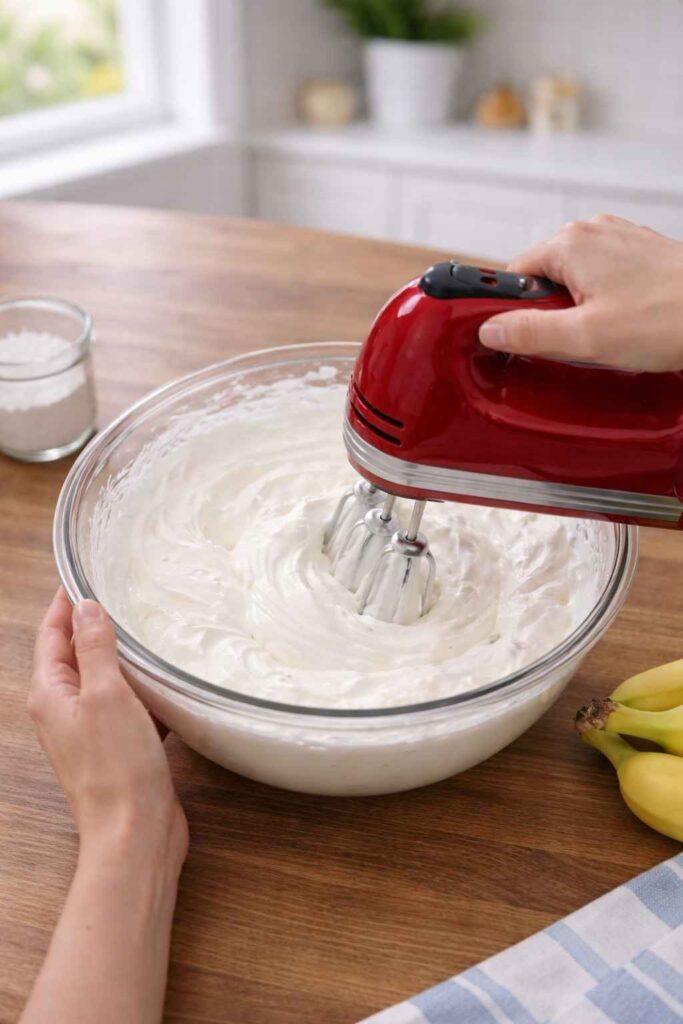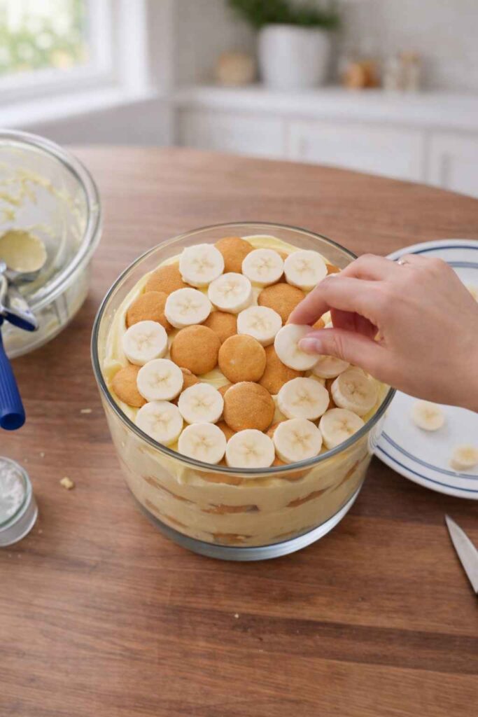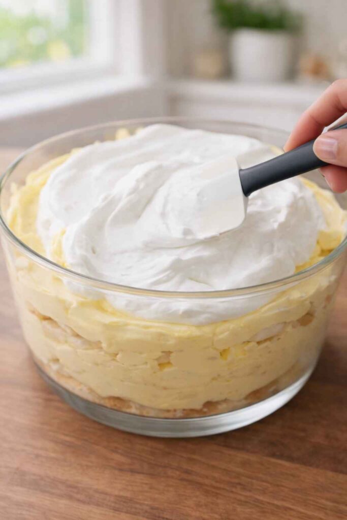 Spread the reserved sweetened whipped cream evenly over the top. For a polished presentation, garnish with a few whole vanilla wafers, cookie crumbles, or a few banana slices right before serving.