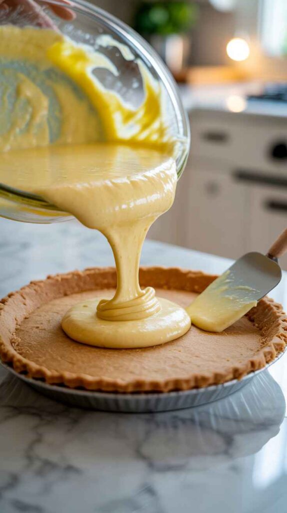 - Fill and smooth: Pour the filling into the chilled crust.Smooth the top with a spatula.