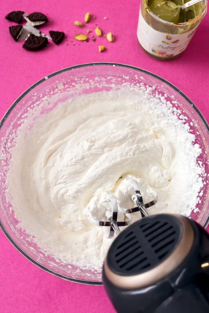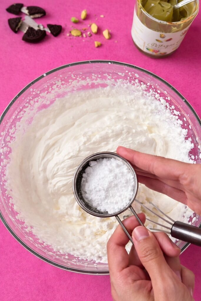 Add powdered sugar and pistachio cream. Beat again until fully incorporated. Scrape down the sides of the bowl to ensure even mixing. - Whip the Cream Separately: