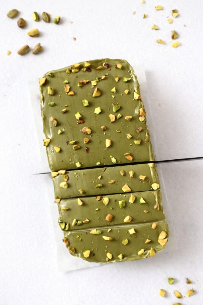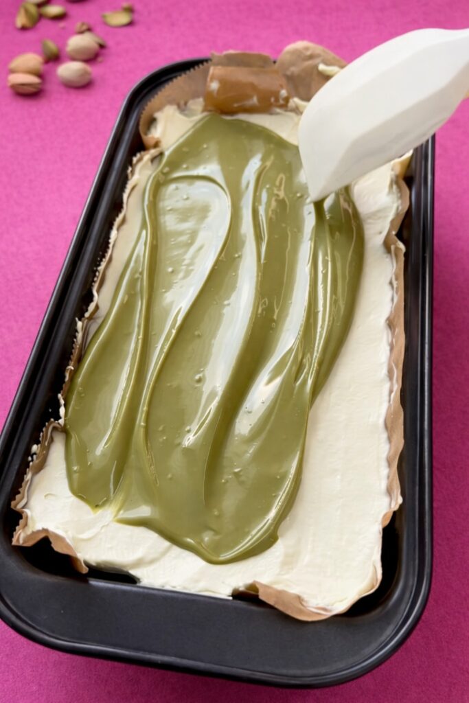 - Slightly warm the pistachio cream in the microwave for 10–15 seconds until pourable.