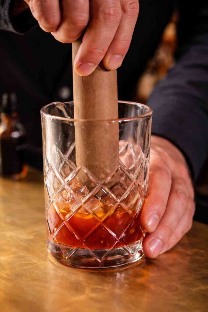 3. Gentle Muddle: With your muddler, gently press and twist the orange peel, sugar cube, and bitters together. The point is not to grind them up, but to dissolve the sugar and let the orange peel’s fragrant aromas out.