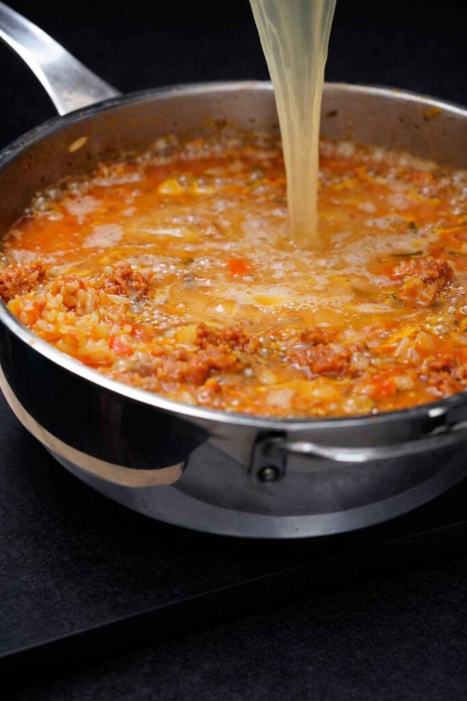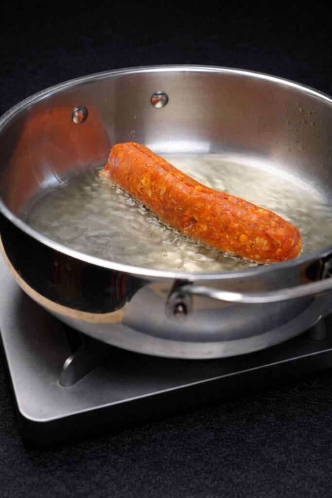 - Brown the Chorizo: Heat olive oil in a high-walled pan over medium heat. Remove chorizo from its casing and brown it, breaking it into small crumbles as it cooks.
