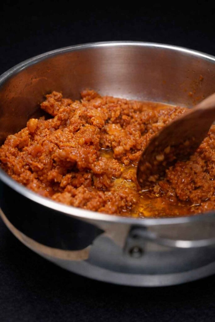 - Seasoning: Stir in dried oregano, dried parsley, and the tomato paste. Reduce heat slightly to prevent the tomato paste from burning.