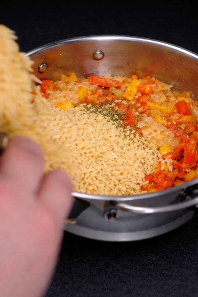 - The Simmer: Add the orzo pasta and the reserved chorizo back into the pan. Pour in the chicken broth. Cover and simmer for about 8–10 minutes until the orzo is tender and most liquid is absorbed.