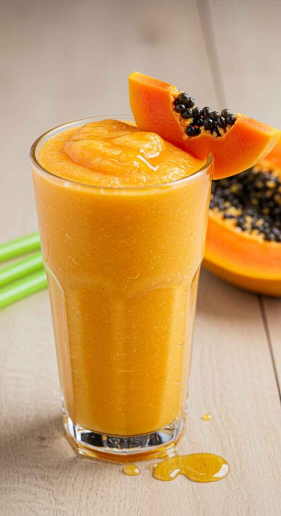 This smoothie shines because it’s simple and balanced. Ripe papaya brings a silky texture and tropical sweetness, while honey adds a gentle floral note that rounds everything out.