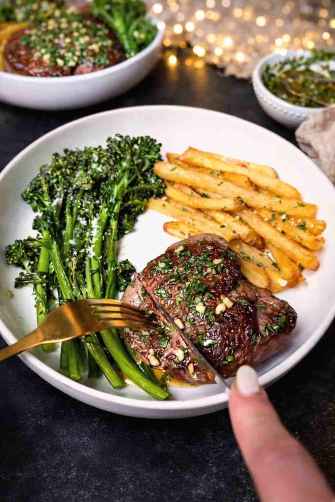 Rich, deeply crusted, butter-basted steak. Bright, garlicky chimichurri. Crispy golden fries. Tender, charred broccolini. It is a dinner that earns silence at the table โ the best kind of compliment any meal can receive.