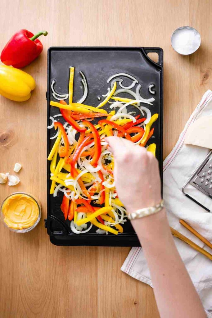 Heat the olive oil in a large, wide skillet or on a flat griddle over medium-high heat until shimmering. Add the sliced onions and bell peppers simultaneously, season generously with salt and black pepper, and toss to coat in the oil. Cook over medium-high heat, stirring regularly, for approximately 6 to 8 minutes — your objective is vegetables that are softened, slightly golden at their edges, and fully tender while still retaining a very slight structural integrity rather than being completely collapsed and mushy. The distinction between “tender-crisp” and “overcooked and soggy” in sautéed peppers comes down to heat management: higher heat for a shorter period preserves some of the vegetable’s cellular structure while still fully cooking it; lower heat for longer will steam the vegetables in their own released moisture, producing a soft, waterlogged texture that makes for a wet, unappealing filling. During the last 60 to 90 seconds of vegetable cooking, push the vegetables to one side of the pan and add the minced garlic to the cleared, oil-coated space. Cook the garlic briefly, stirring constantly, until it is fragrant and just beginning to turn the palest gold at its edges. Garlic’s sugars burn at a lower temperature than most other aromatics, and the bitter, acrid flavor of scorched garlic is difficult to correct once present in the filling — adding it late protects against this risk entirely.