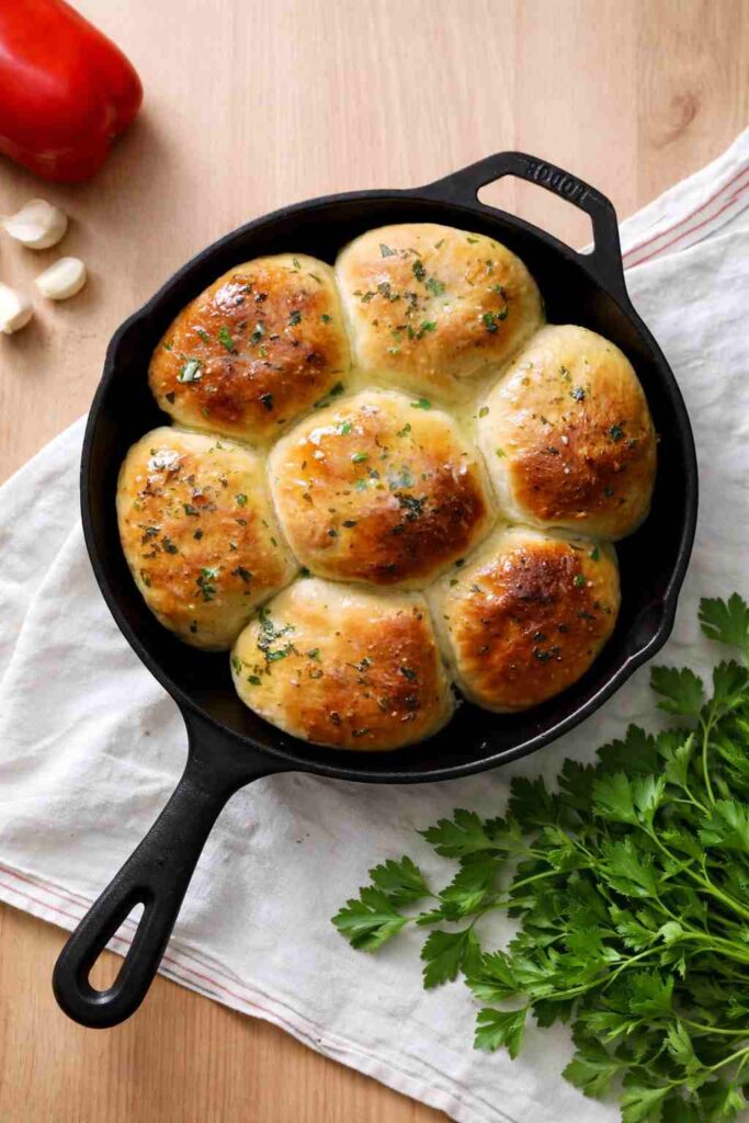 The moment the rolls come out of the oven, while they are still steaming hot, brush the remaining garlic butter mixture generously over every surface. The residual heat of the rolls immediately melts and absorbs this second butter application, adding a fresh, bright garlic-herb flavor and a glossy sheen to the surface that the baked-in first coat alone could never provide. Allow the rolls to rest for 3 to 4 minutes before serving — just long enough for the interior cheese to stabilize slightly from its fully molten state and for the dough structure to set enough to hold its shape when pulled apart. Serve directly from the cast-iron skillet for maximum visual impact, accompanied by warm cheese sauce or a spicy horseradish mayo.