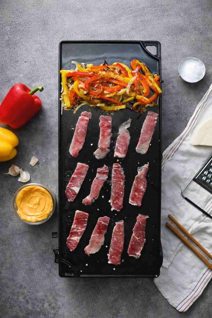 Push veggies aside; sear shaved ribeye in the hot center 2–3 minutes. Mix with veggies and cool 5 minutes before assembling.