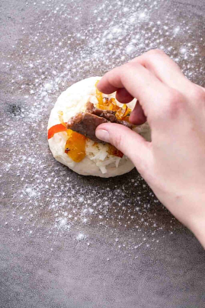 Working with one flattened dough disc at a time, layer the filling in the following order. First, place a small layer of shredded or thinly sliced provolone directly onto the center of the dough disc — this first cheese layer acts as a moisture barrier between the dough and the filling, preventing the meat juices from penetrating the raw dough and creating a soggy bottom. Second, add a generous spoonful (approximately 2 tablespoons) of the steak and vegetable filling on top of the cheese. Third, add a second pinch of provolone on top of the filling — this top cheese layer will melt during baking and create the stretchy, flowing molten cheese interior that makes the finished roll so satisfying to pull apart. Do not overfill: the temptation to pack each roll generously is understandable, but an overfilled roll cannot be properly sealed and will leak during baking, producing an open seam that allows the filling to escape and the dough around the opening to remain raw and doughy.