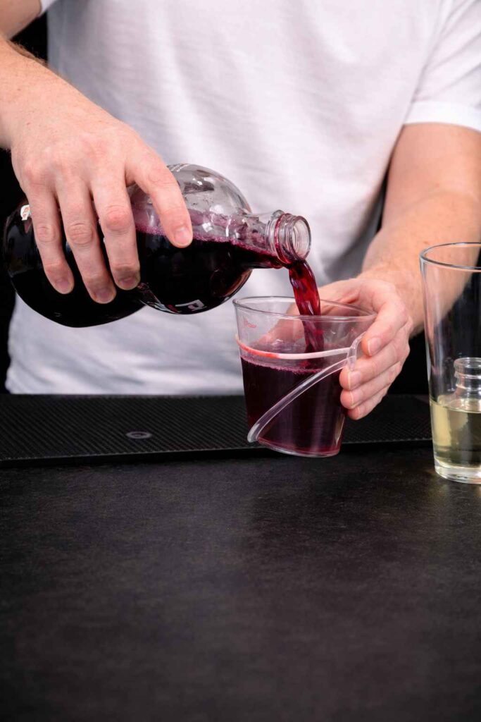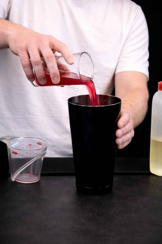 2. Add Pomegranate Juice: Then, put 2 ounces (60 ml) of pomegranate juice in the shaker.