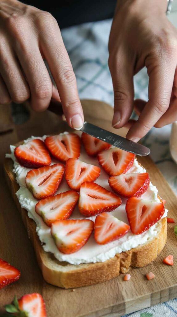 - Spread the ricotta: While the toast is still warm, spread a generous layer of ricotta from edge to edge. This keeps the strawberries from sliding off.