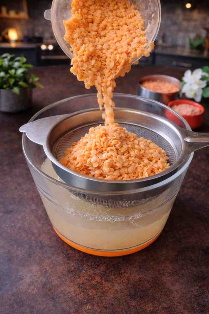 Measure out 1 cup of red lentils and rinse them thoroughly under cold running water until the water runs clear. Transfer them to a bowl, cover with plenty of water, and allow them to soak for a minimum of 4 hours. For the best results and the smoothest possible paste, soaking overnight is ideal. Once soaked, drain completely through a fine-mesh strainer and shake off any excess water.