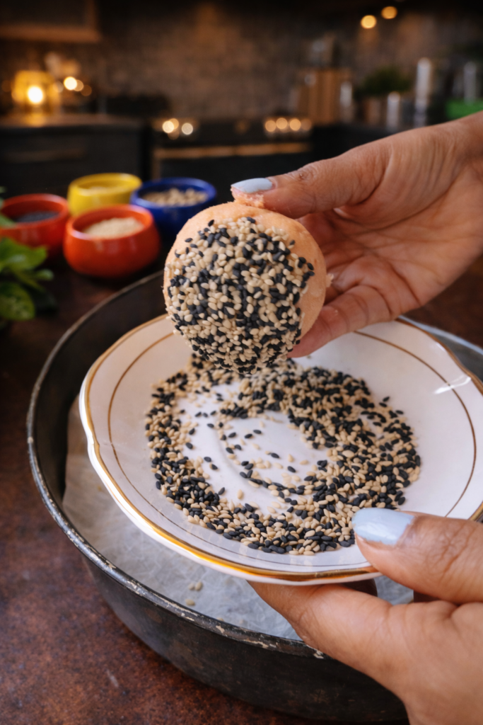 Lightly oil your palms to prevent sticking. Divide the dough into 6 equal portions and roll each one between your palms into a smooth, compact ball. For a bakery-style finish, roll each bun in sesame seeds, pumpkin seeds, or sunflower seeds, pressing gently so they adhere. Place the shaped buns on a baking tray lined with parchment paper, spacing them evenly apart.