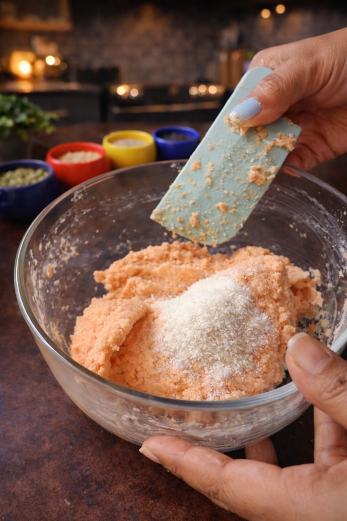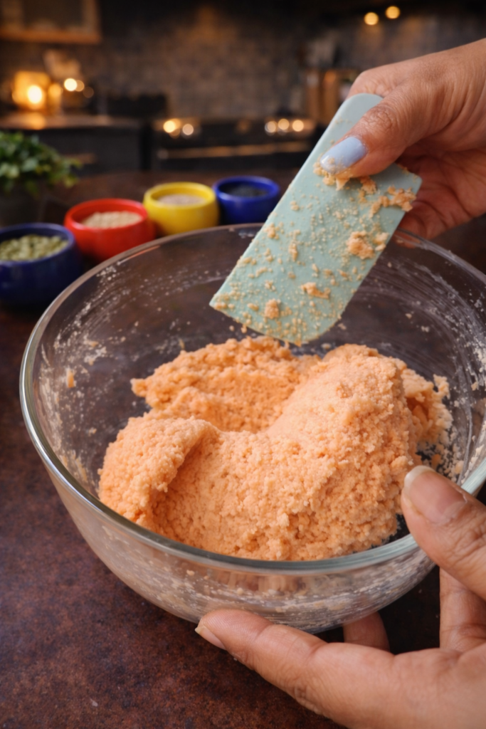 Add the olive oil, salt, and psyllium husk to the lentil paste. Stir everything together vigorously. As you mix, you will notice the batter transforming — the psyllium husk absorbs moisture rapidly, thickening the mixture from a runny batter into a soft, workable dough. Continue mixing until the dough holds its shape and no longer sticks to the sides of the bowl.