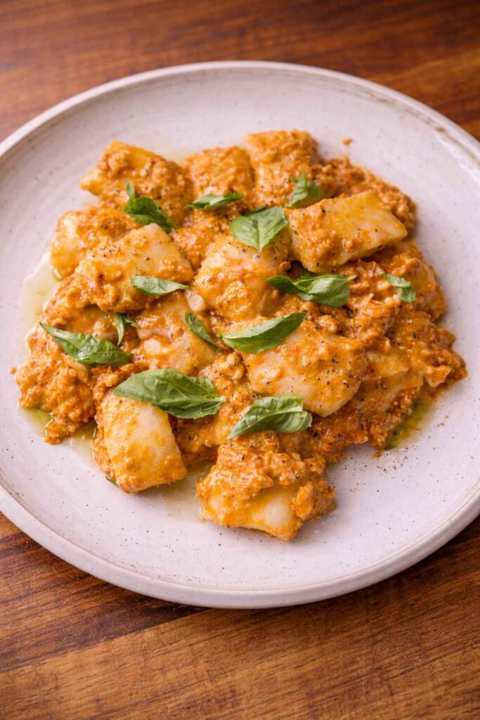 - Combine and Serve: Toss the cooked gnocchi with the red pesto until well-coated. Garnish with fresh basil and extra Parmesan.