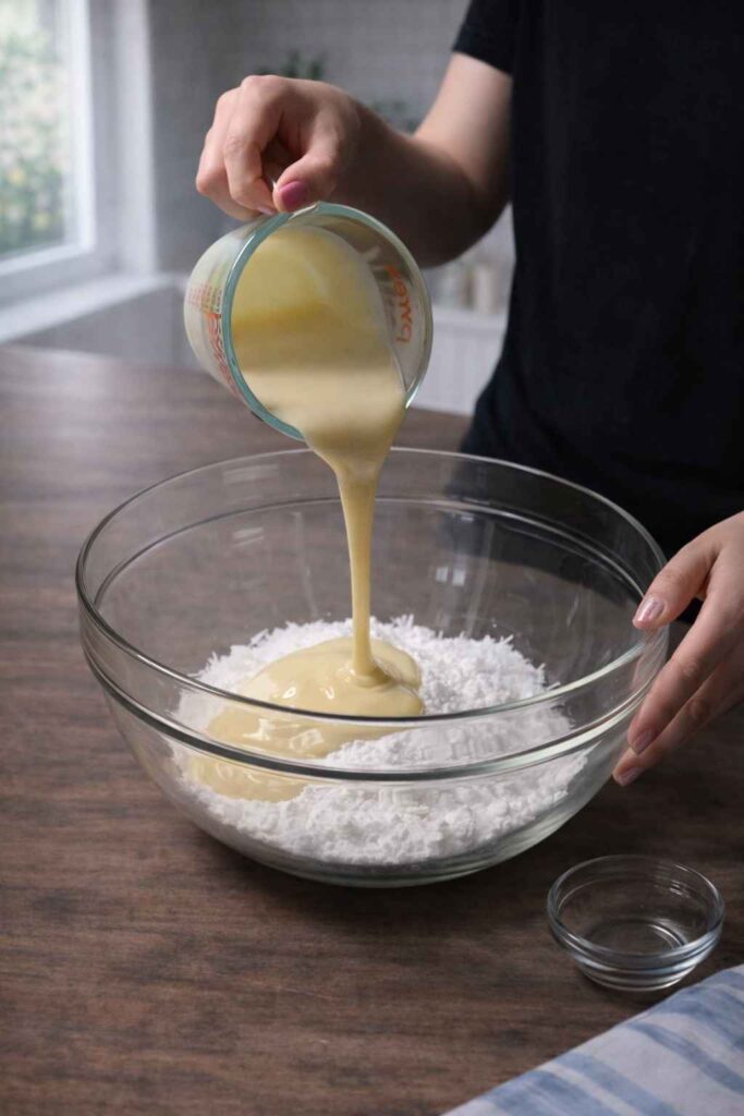 In a medium bowl, combine the shredded coconut, sweetened condensed milk, and powdered sugar. Stir thoroughly until a sticky, cohesive mixture forms. Set aside. For deeper flavor, spread the coconut on a baking sheet and toast it at 350°F (175°C) for about 10 minutes, stirring halfway, until lightly golden before mixing.