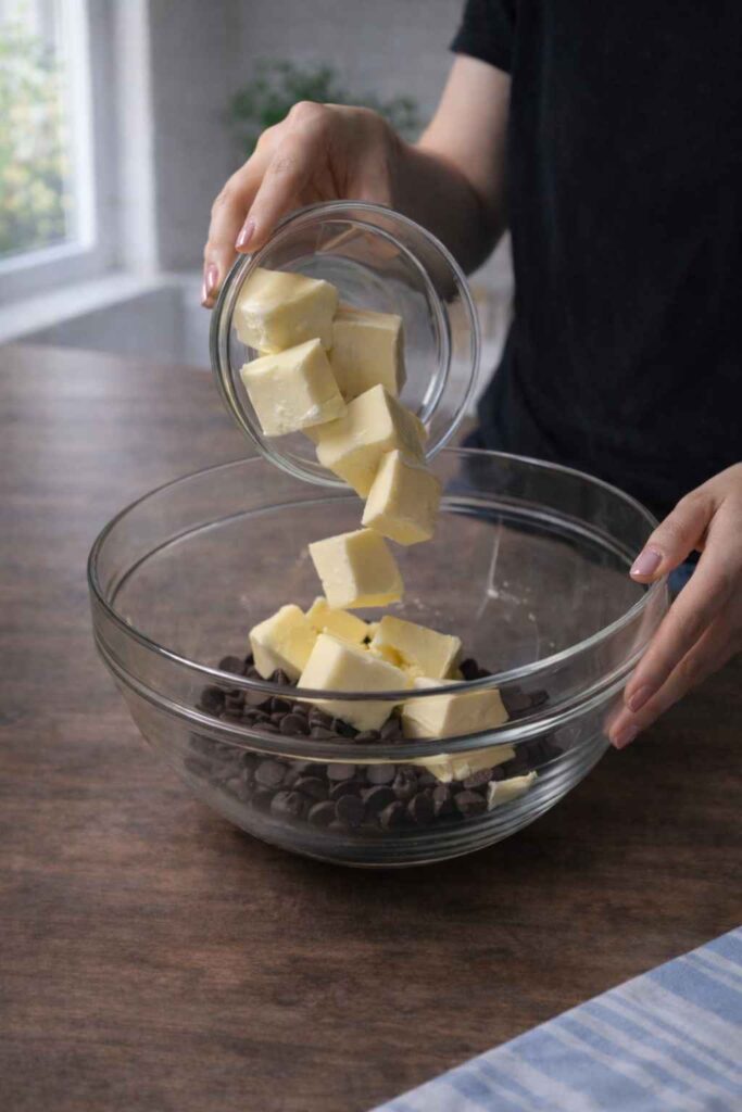 In a microwave-safe bowl, combine the chocolate chips and butter. Microwave in 30-second intervals, stirring between each, until the chocolate is mostly melted. Continue stirring until the mixture is fully smooth and glossy. Allow it to cool slightly before adding to your brownie batter.