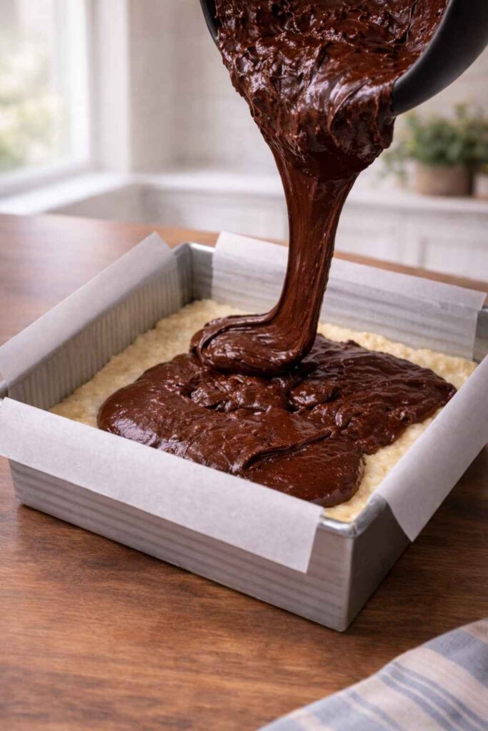 Follow the brownie mix box instructions to combine wet ingredients. Once combined, beat the mixture for 2–3 minutes to help dissolve the sugar — this is the key step for achieving that coveted crinkly top. Gently fold in the dry ingredients until just incorporated; do not overmix.