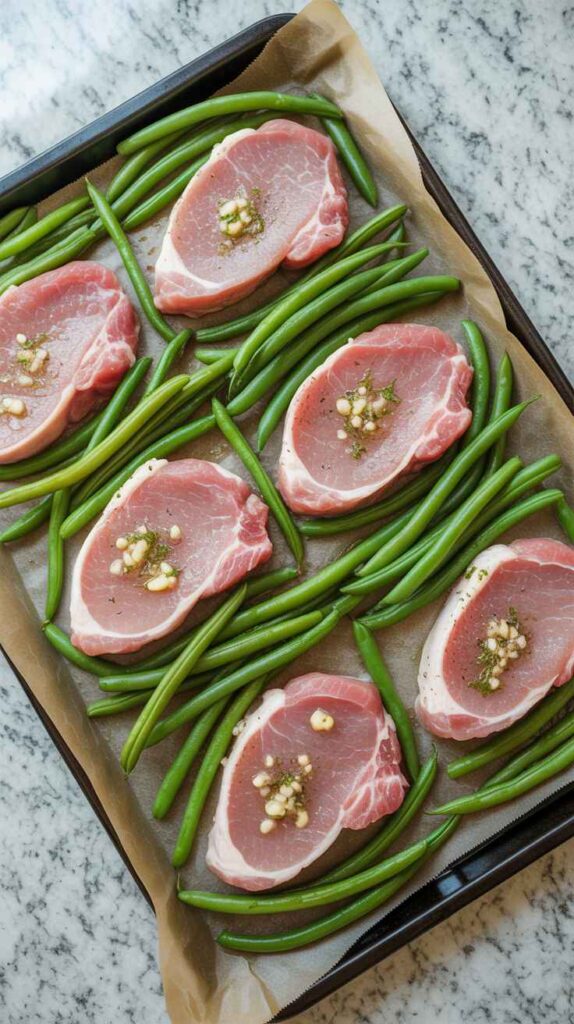 - Arrange on the pan: Spread the green beans out in an even layer on the sheet pan, leaving space for the pork. Nestle the pork chops among the beans without crowding. Space helps everything roast instead of steam.