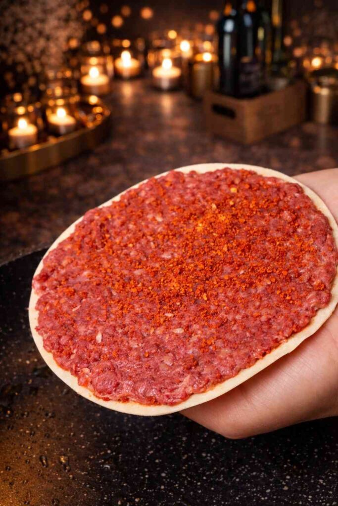 Divide the 500g of minced beef into 8 equal portions — approximately 62 to 65g each. Roll each portion into a smooth ball between your palms. Place one ball of mince directly in the centre of each corn tortilla. Using your hands or a flat-bottomed glass, press the mince firmly and evenly across the surface of the tortilla, spreading it as close to the edges as possible in an even, thin layer. The thinner the layer, the crispier the crust will be during cooking.