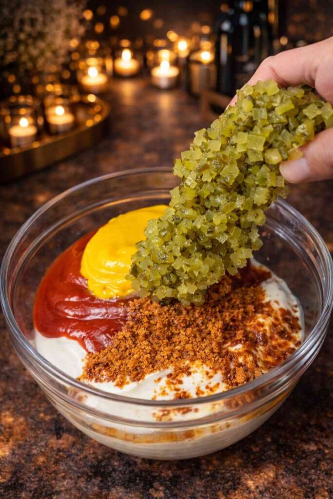 Taste the sauce and adjust to your preference — more pickle for tanginess, more ketchup for sweetness, more mustard for sharpness. The pickle juice is a small but crucial addition that gives the sauce an authentic burger-sauce quality that plain diced pickles alone can’t achieve. Cover and refrigerate until needed.