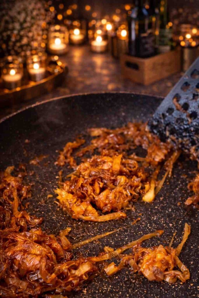 Cook for 25 minutes, stirring regularly — every 3 to 4 minutes — to ensure the onions colour evenly without burning. As the onions cook, they will soften dramatically, shrink considerably, and gradually deepen in colour from white to golden to a rich, deep amber. If at any point the pan looks dry or the onions are beginning to stick, add a small splash of water and stir it through. The water will deglaze the pan and prevent burning while the onions continue to caramelise.
