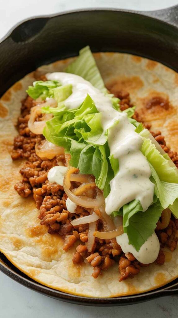 The burger sauce uses Greek yoghurt as its base, making it lighter than a traditional mayo sauce without sacrificing any of the creamy, tangy, pickle-forward character that makes a great burger sauce so addictive. The smashed beef, pressed directly onto the tortilla and cooked meat-side down, develops a beautifully crispy, caramelised crust that fuses with the tortilla beneath it into something extraordinary.