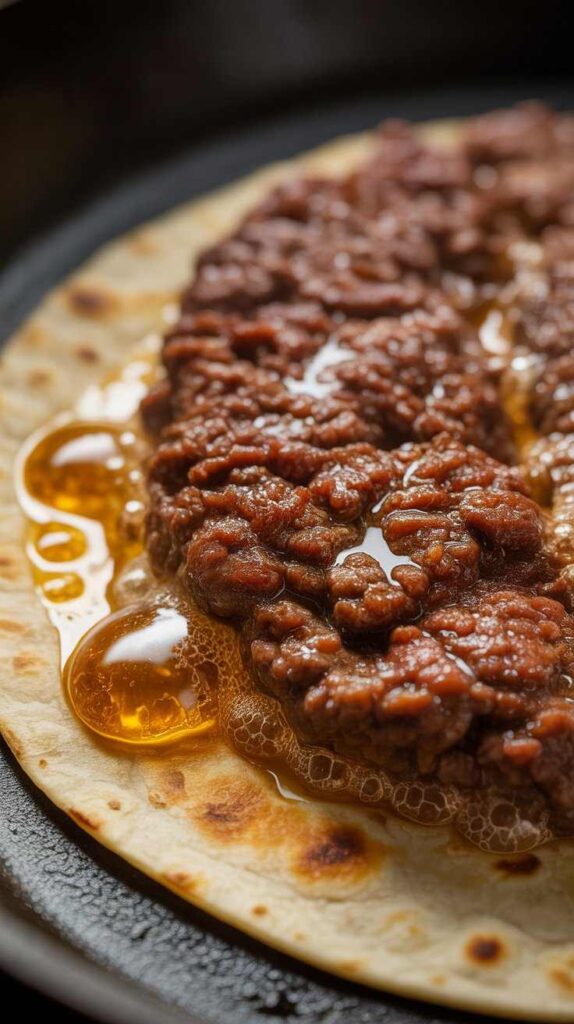 Applying that technique directly onto a corn tortilla rather than a bun is the genius step that transforms this from a burger into something entirely new. The meat acts as a seal between the tortilla and the pan, protecting the tortilla from direct heat while the beef side crisps up. When the whole thing is flipped, the tortilla side toasts gently in the residual fat and beef juices, becoming lightly golden and slightly crisp at the edges. The result is a taco that is structurally perfect — firm enough to hold all the toppings without falling apart, but flexible enough to fold and eat with your hands.