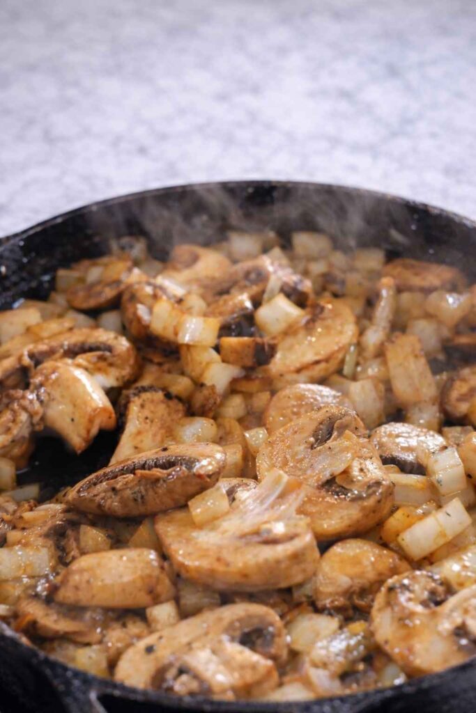 Reduce the heat to medium-low and add the butter to the same skillet. Allow it to melt, swirling to coat the pan and capturing any browned bits left behind from the searing — those bits are concentrated flavor and should not go to waste. Add the diced yellow onion to the butter and cook, stirring occasionally, for about 2 minutes until it begins to soften. Add the sliced mushrooms to the pan and stir everything together. Cook the onion and mushroom mixture for approximately 6 minutes total, stirring regularly, until the mushrooms have released their liquid, that liquid has largely evaporated, and both the mushrooms and onions are tender, lightly golden, and deeply fragrant. This evaporation step is important — it concentrates the mushroom flavor and prevents the gravy from becoming thin and watery.