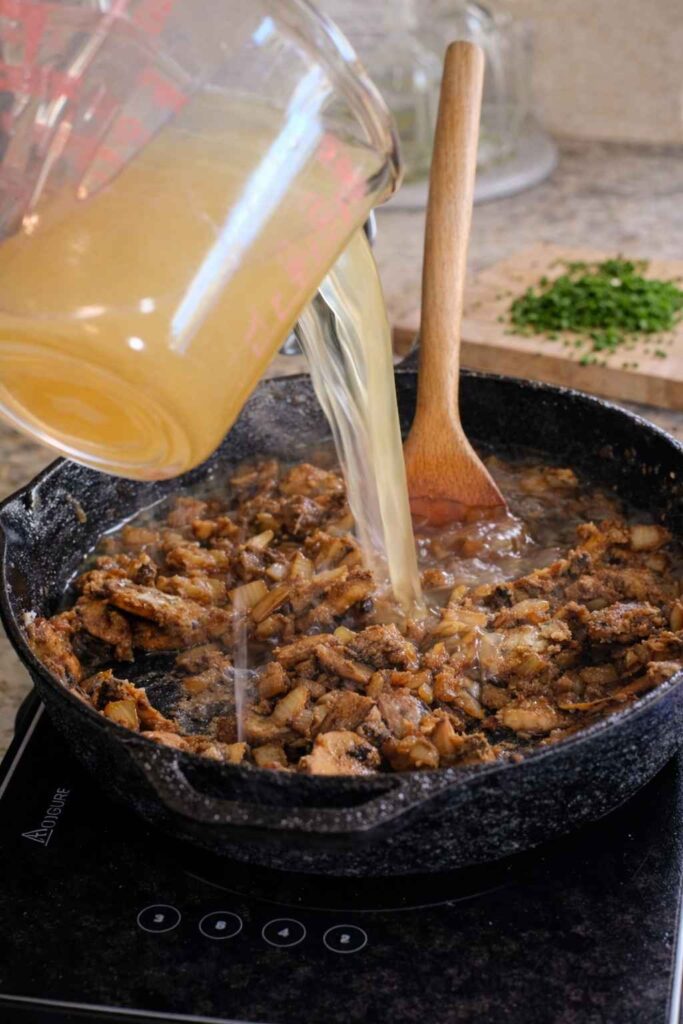 Now comes the technique that separates a smooth, velvety gravy from a lumpy one: add the chicken broth one large splash at a time, stirring completely and vigorously after each addition before pouring in the next. This gradual hydration of the flour mixture prevents the formation of lumps by giving the starch granules time to incorporate smoothly into the liquid before more liquid is added. If you pour all the broth in at once, the flour clumps into pockets that are nearly impossible to smooth out after the fact. Patience during this phase — which takes only about 2 to 3 minutes in total — is the single most reliable way to guarantee a perfectly smooth gravy every time. Continue adding broth splash by splash, stirring thoroughly after each addition, until all the broth is incorporated and the gravy is smooth, glossy, and beginning to thicken.