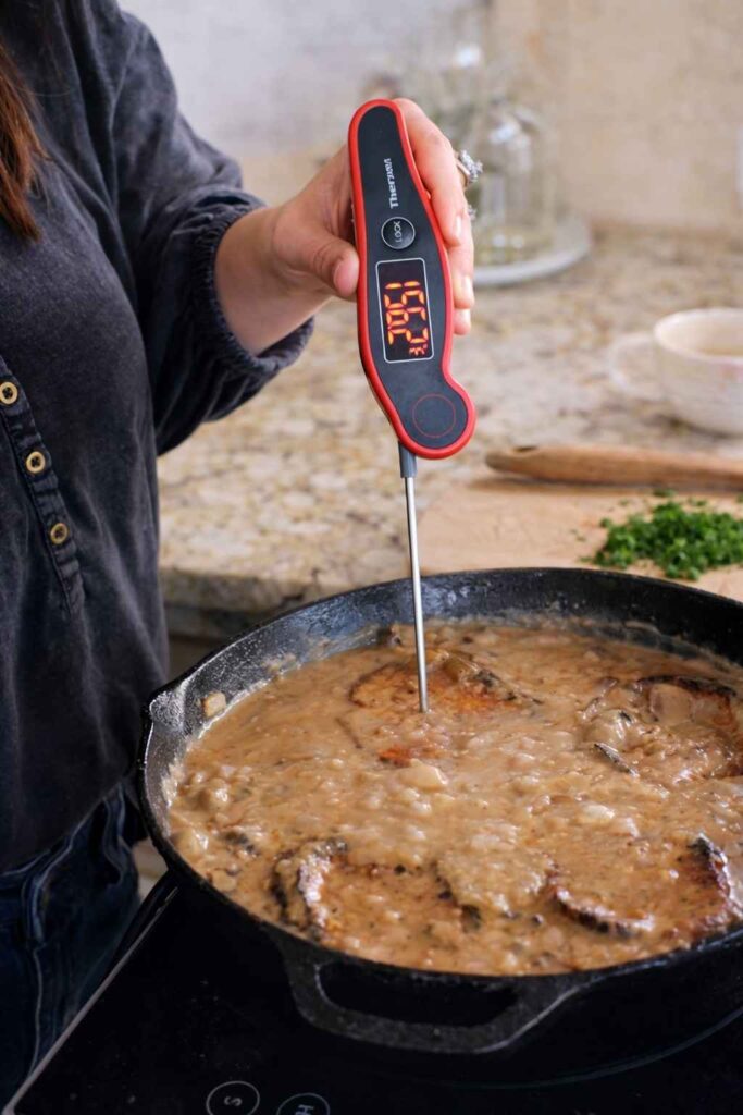 Use an instant-read meat thermometer to check the internal temperature of the thickest chop. You are looking for 150°F (65°C) as your pull temperature. At this temperature, pork loin chops are fully safe to eat and at their absolute juiciest. If you cook them to the older recommended temperature of 160°F, you will notice a meaningful difference in texture — drier, less forgiving, and noticeably tougher. Pull them at 150°F, allow them to rest in the gravy for 2 to 3 minutes as the pan comes off the heat, and the residual cooking will bring them to a perfect final temperature.