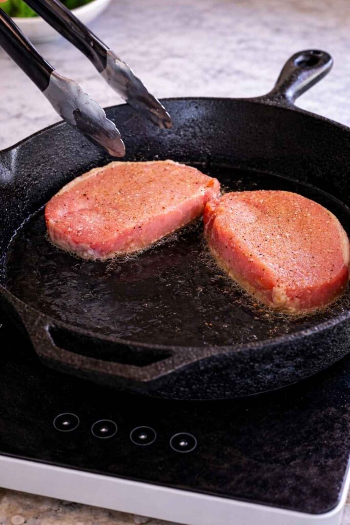 Carefully lay the seasoned pork chops into the hot pan, ensuring that no two chops are touching each other. Crowding the pan drops the pan temperature dramatically and causes the meat to steam rather than sear. If your skillet cannot comfortably fit all four chops without them touching, sear in two batches rather than compromising the quality of the crust.