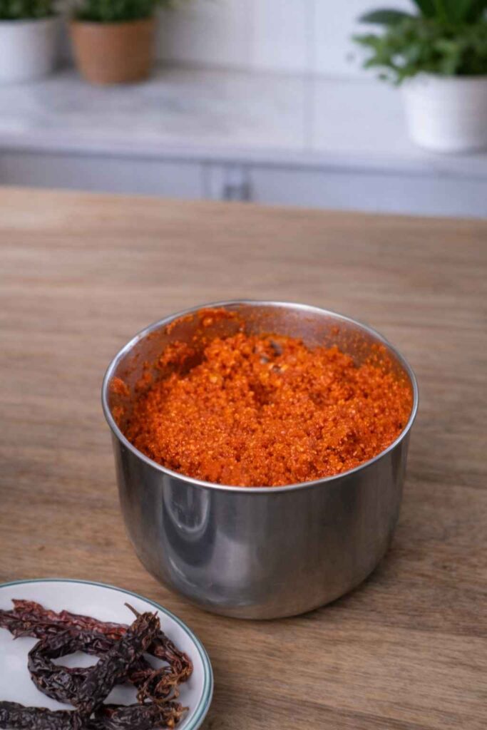 In a food processor or blender, combine the chopped red onions, garlic cloves, red chili powder, and a pinch of salt. Pulse into a coarse paste.