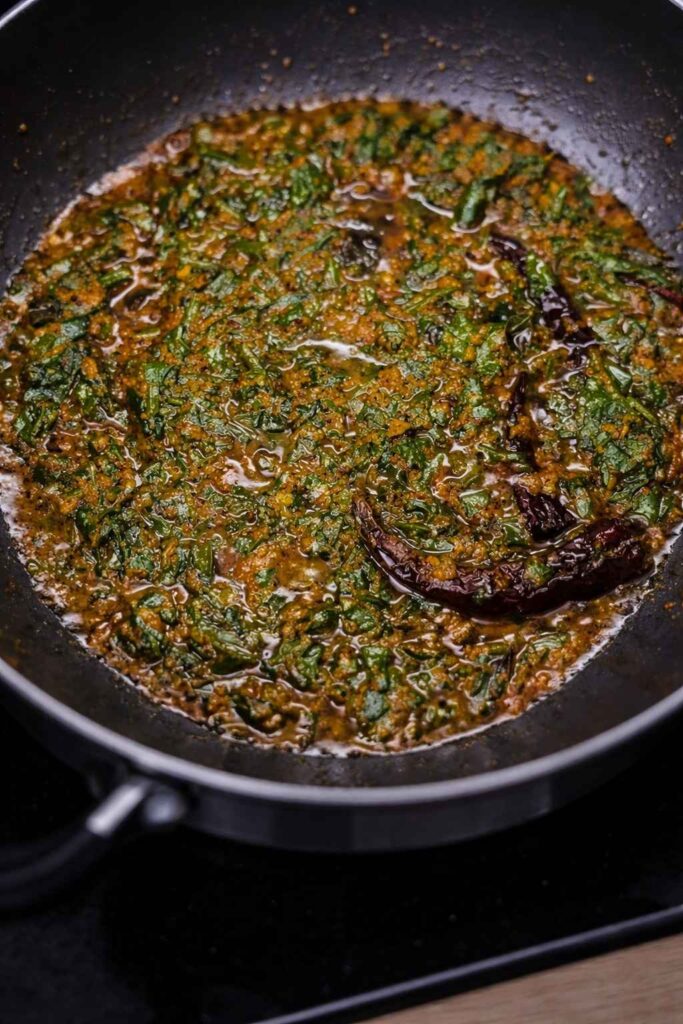 Heat oil in a large skillet over medium heat. Once hot, add mustard seeds. When they begin to pop, add cumin seeds, dried red chilies, and curry leaves.