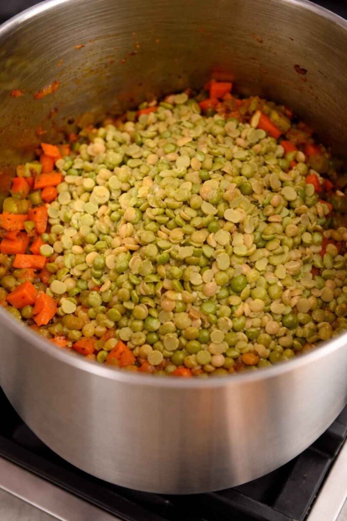 Put the dried split peas in a big bowl and cover them with 3 cups of cold water the night before you want to make this soup. Let them soak for at least 8 hours, but overnight is best. When you’re ready to cook, don’t hold back and throw away all the soaking water. Wash the peas well under cold running water until the water runs clear. Then set them aside. This step is not optional and not just a tradition; it is a basic part of cooking that will change the texture of your finished soup.