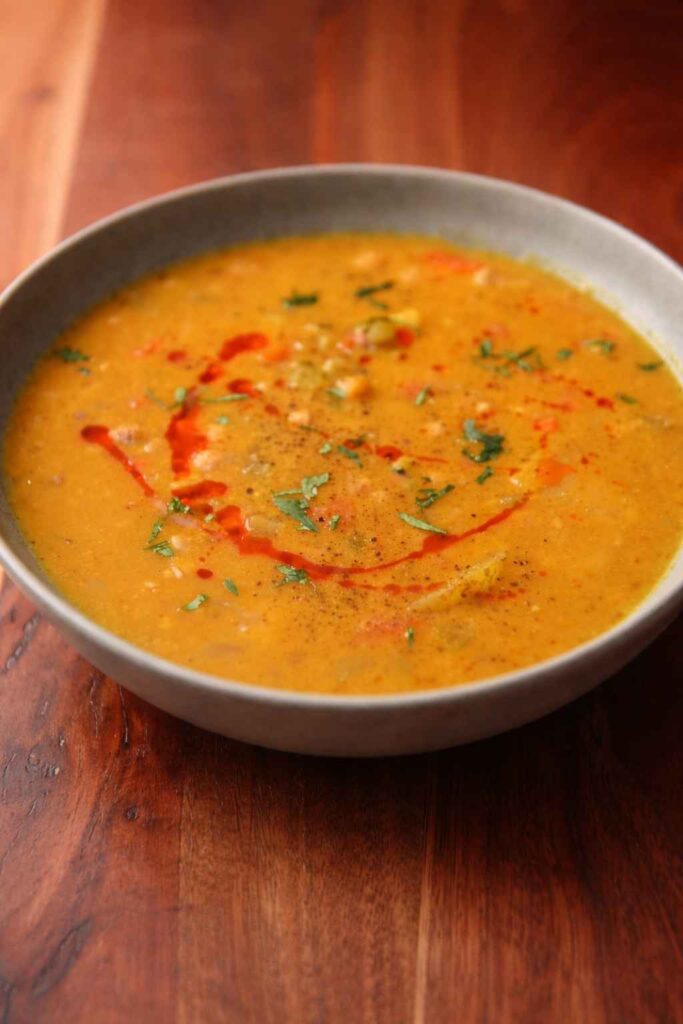 Thick, velvety split pea soup with chickpeas, potatoes, warm spices, and lemon brightness