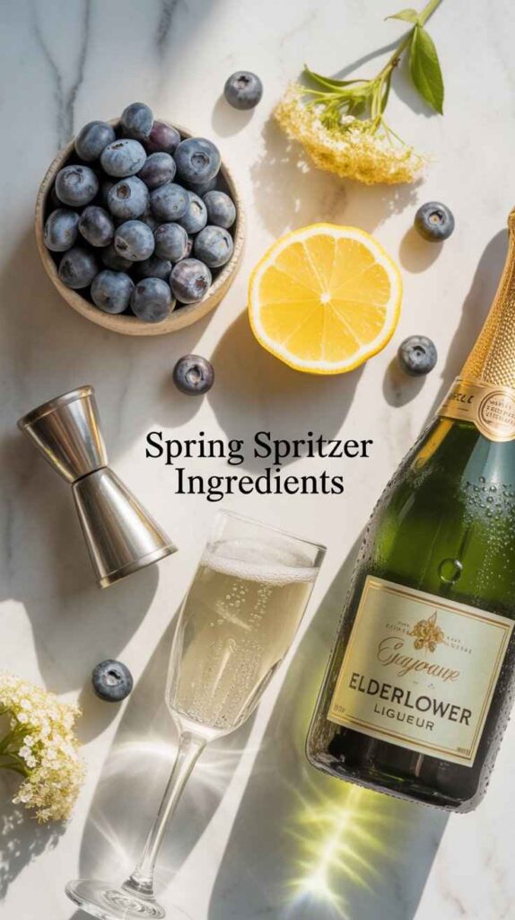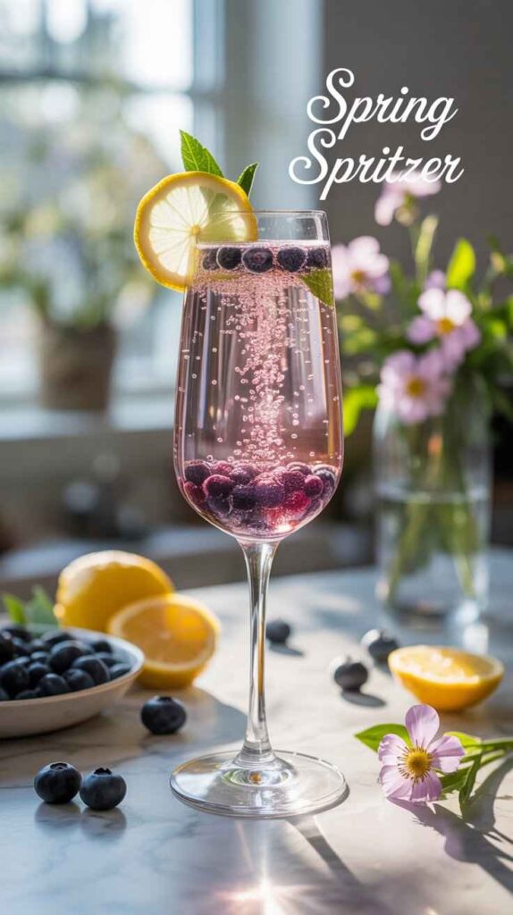 The Spring Spritzer earns its seasonal name through both its ingredients and its character. Elderflower blooms in late spring across Europe and the UK — typically May and June — and the liqueur made from those blossoms carries the scent of that specific season in every drop. Blueberries coming into season in spring and early summer bring that fresh, just-ripe fruit quality that feels distinctly of the warmer months ahead. The champagne’s effervescence, the brightness of the lemon, and the light, floral overall character of the finished drink all create a sensory experience that feels genuinely spring-like — fresh, hopeful, lively, and delicately beautiful.