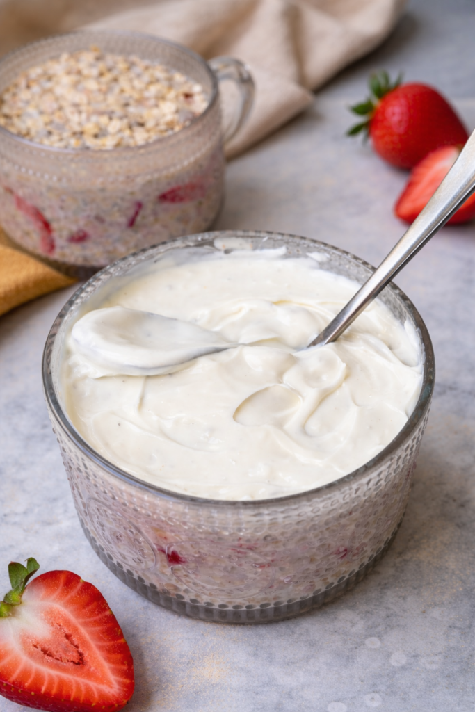 Top with fresh sliced strawberries for added color, freshness, and texture. A sprinkle of granola adds a satisfying crunch if you enjoy textural contrast. A small dollop of extra Greek yogurt swirled on top makes the presentation even more beautiful and adds another layer of creaminess.