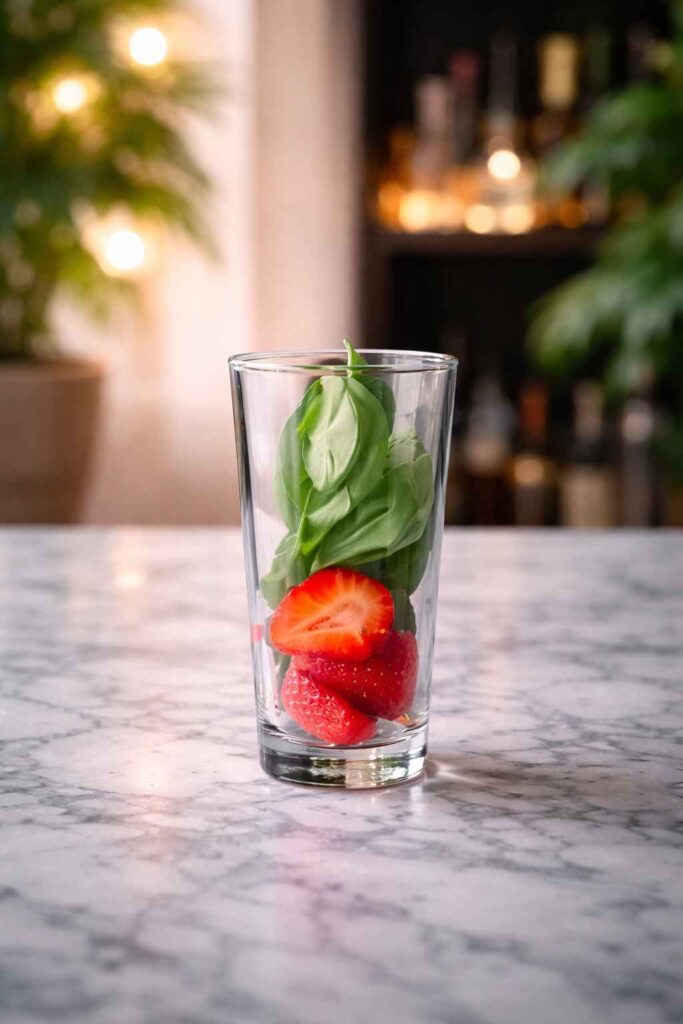 Before you begin muddling, take a moment to properly prepare all your ingredients. Wash the strawberries under cold running water, pat them completely dry, and remove the green hull with a small paring knife. Roughly chop each strawberry into three or four pieces — smaller pieces muddle more easily and release juice more quickly than large halves. For the basil, select the seven largest, greenest, most fragrant leaves from your bunch, avoiding any yellowed, wilted, or bruised leaves as these contain degraded essential oils and will contribute minimal aroma. Rinse the basil leaves gently, shake off excess water, and pat dry with a clean paper towel. A dry basil leaf adheres better to the muddler and releases its oils more efficiently than a wet one. Prepare your lime juice in advance by cutting the lime in half and squeezing firmly through a fine strainer into a small bowl, removing any seeds. Measure exactly 15ml using a jigger for consistency.