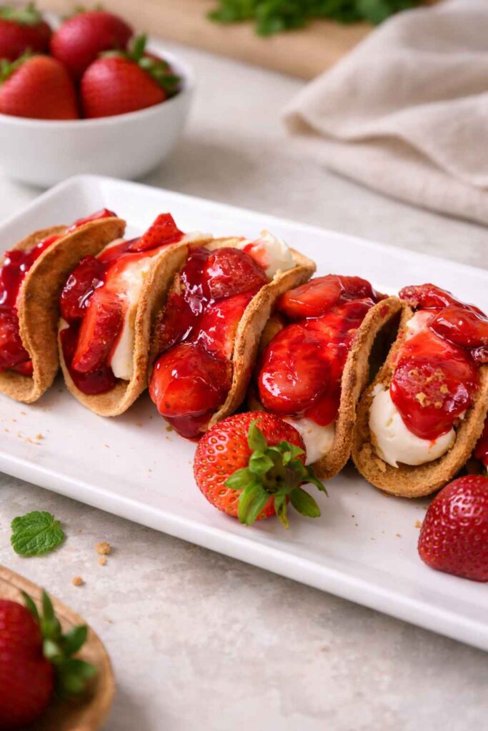 There are desserts that satisfy, and then there are desserts that stop conversations. Strawberry Cheesecake Tacos belong firmly in the second category. This recipe takes two of the most universally beloved foods in existence — the taco and the New York-style cheesecake — and fuses them into something that feels simultaneously playful, sophisticated, and deeply indulgent. At first glance, it sounds almost too clever, the kind of idea that looks better on social media than it tastes in real life. But one bite through that crunchy, golden, graham cracker-coated tortilla shell and into the cloud-like whipped cream cheese filling beneath a glossy crown of macerated strawberries, and you’ll understand immediately why this dessert has become an obsession for home bakers and brunch enthusiasts worldwide. What makes this recipe particularly brilliant is its architecture: every layer has been engineered to deliver a specific sensory experience. The shell delivers crunch. The filling delivers richness and tang. The strawberries deliver brightness and acidity. Together they form a perfectly balanced bite that hits every note on the flavor spectrum simultaneously. Whether you’re closing out a summer dinner party or looking for the most dramatic possible end to a Taco Tuesday, this is the dessert that delivers every single time. Let’s build it from scratch.