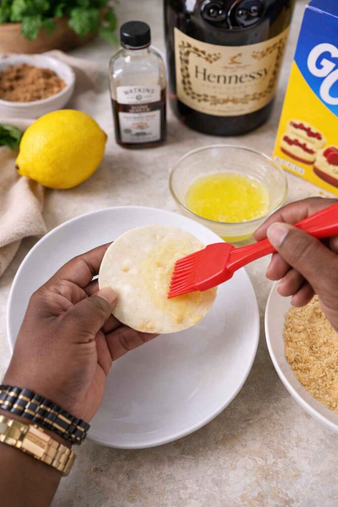 Melt half a stick (4 tablespoons) of unsalted butter in a small saucepan over low heat or in the microwave in 20-second intervals until completely liquid. Using a pastry brush — or the back of a spoon if a brush is unavailable — coat each tortilla circle generously and evenly with the melted butter on both sides. Do not be shy with this step: the butter serves two critical functions simultaneously. First, it acts as the adhesive that allows the graham cracker coating to stick to the entire surface of the tortilla without falling off during baking. Second, it conducts heat during baking, promoting even, uniform browning and crispness across both faces of the shell. Any unbuttered or under-buttered patches will remain pale and soft after baking, creating weak spots in your finished shell. Brush methodically from the center outward on each side and hold the circle up to the light briefly to ensure you have full, glistening coverage.
