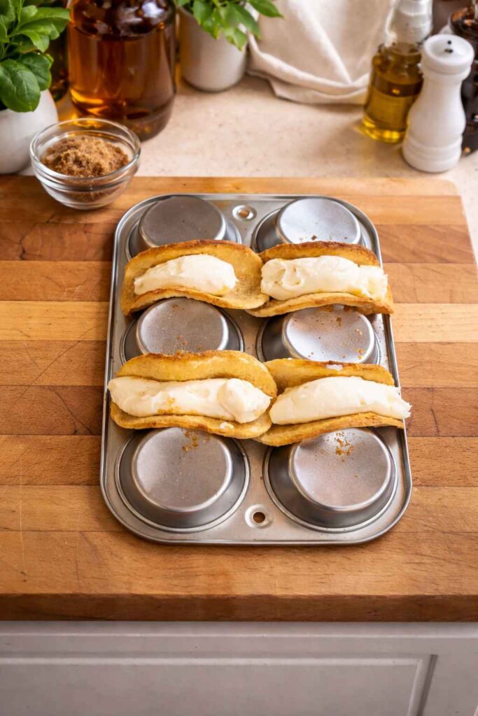 This step is the defining kitchen hack that elevates this recipe from a flat, mediocre round to a proper taco vessel. Take a standard 12-cup muffin tin and flip it completely upside down on a baking sheet so that the raised bottoms of the muffin cups are now pointing upward. Take each graham-cracker-coated tortilla circle and drape it into the channel — the gap between two adjacent upturned muffin cups — pressing gently so the sides of the tortilla fall naturally downward on either side, creating a shallow U-shape or taco shell curve. The upturned cups act as a mold, holding the tortilla in the perfect arc during baking. Nestle each tortilla circle securely into its own channel, ensuring it won’t slip or flatten during baking. You should be able to fit 4 to 6 shells on a single inverted muffin tin. Place the muffin tin carefully into your preheated 400°F (200°C) oven and bake for approximately 11 minutes, checking at the 8-minute mark, until the shells are uniformly deep golden brown, fully rigid, and visibly crisp at the edges. Remove from the oven and allow the shells to cool on the inverted tin for a full 5 minutes before handling. This resting period is non-negotiable — the sugar in the coating needs time to cool and re-solidify into a rigid, glass-like layer that gives the shell its structural integrity.